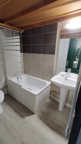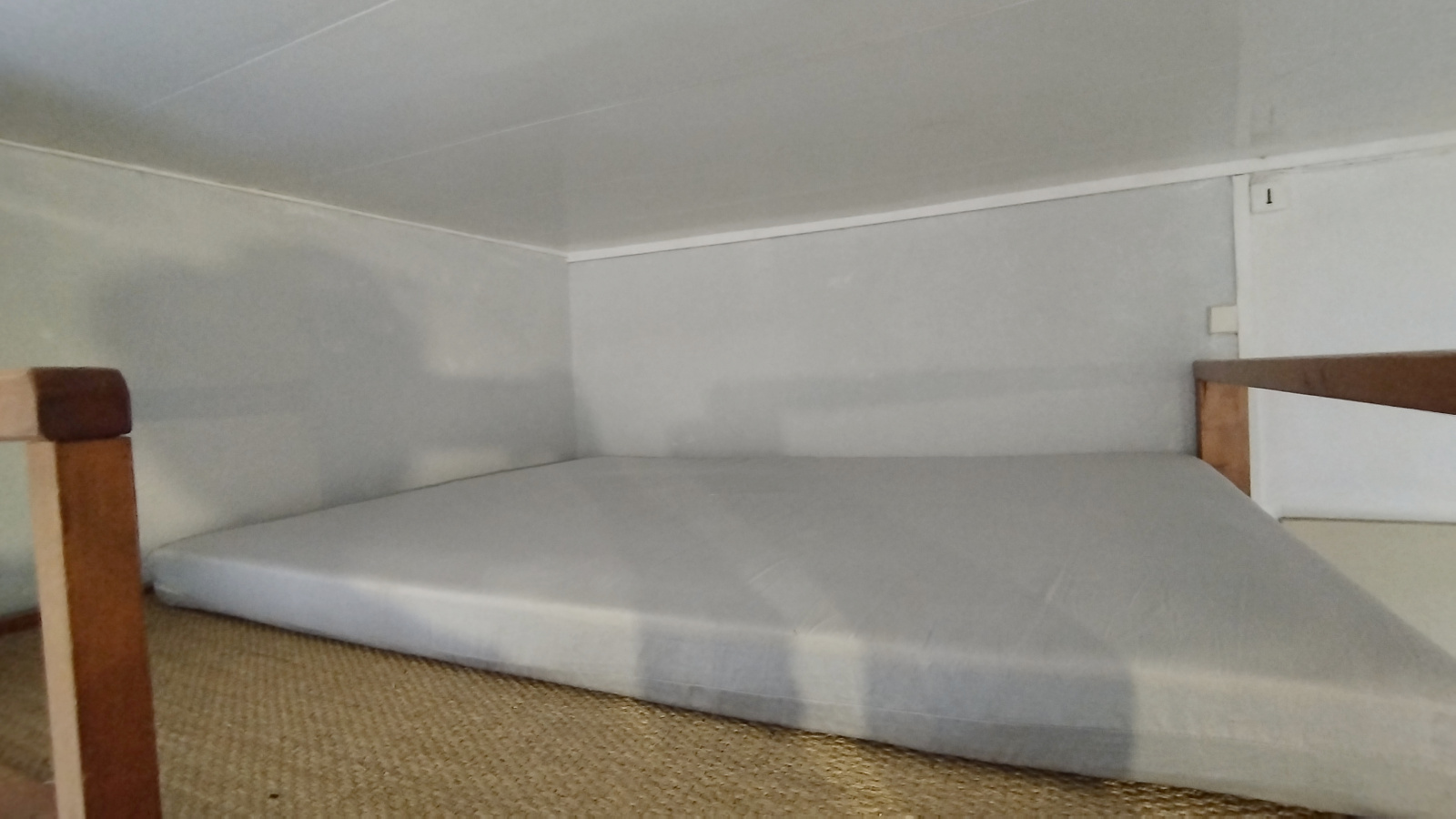 Il se compose d'une pièce de vie avec bar, armoire, bureau, une kitchenette équipée de plaques de cuisson, d'un frigo top et d'un micro-onde, salle de bain avec baignoire et lit sur la mezzanine. L'appartement donne sur la cour arrière.