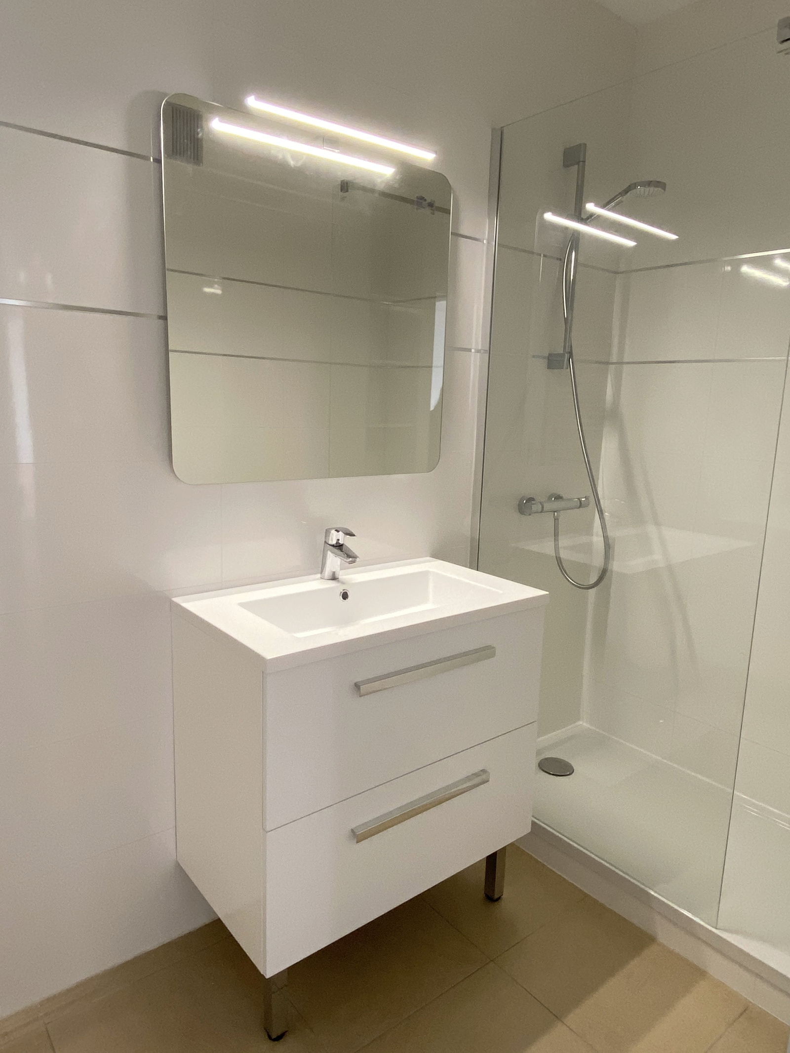Il se compose d'une entrée/couloir avec placard, d'une cuisine (équipée d'une plaque électrique, d'une hotte, un four et un micro-ondes), un séjour avec balcon, une chambre, une salle de bain avec douche et un WC séparé. Place de parking privative.