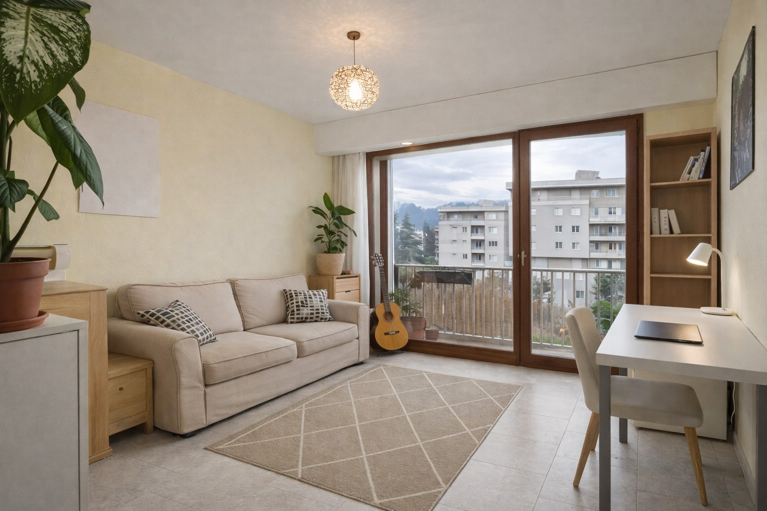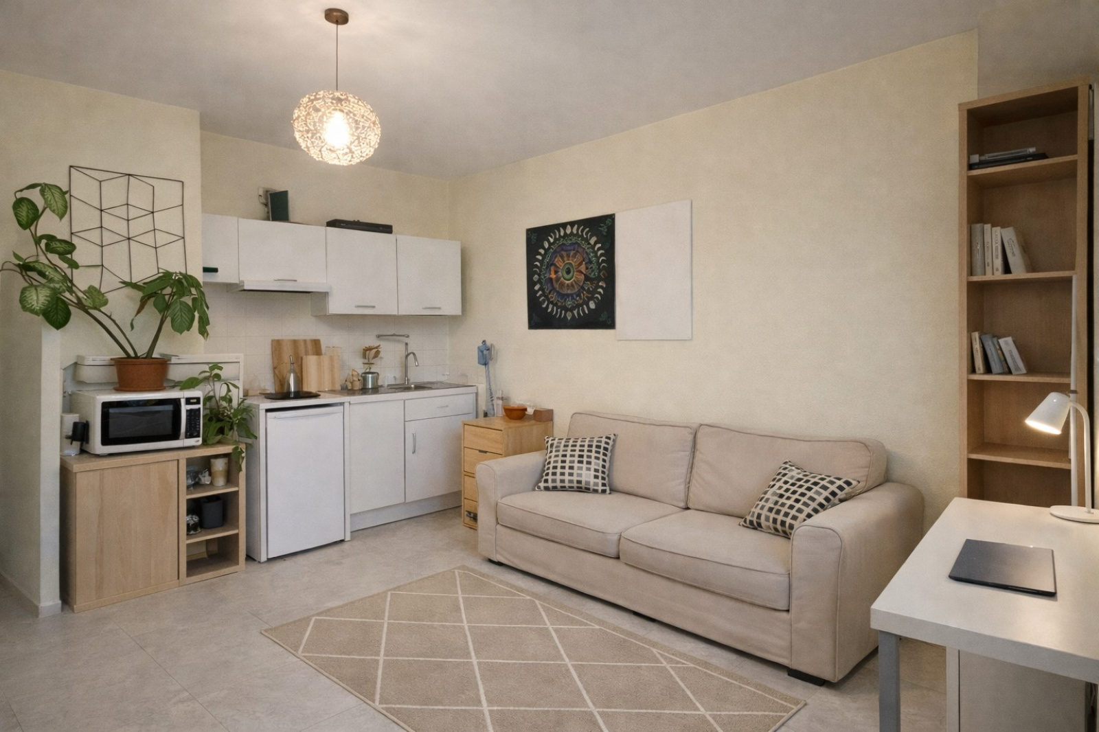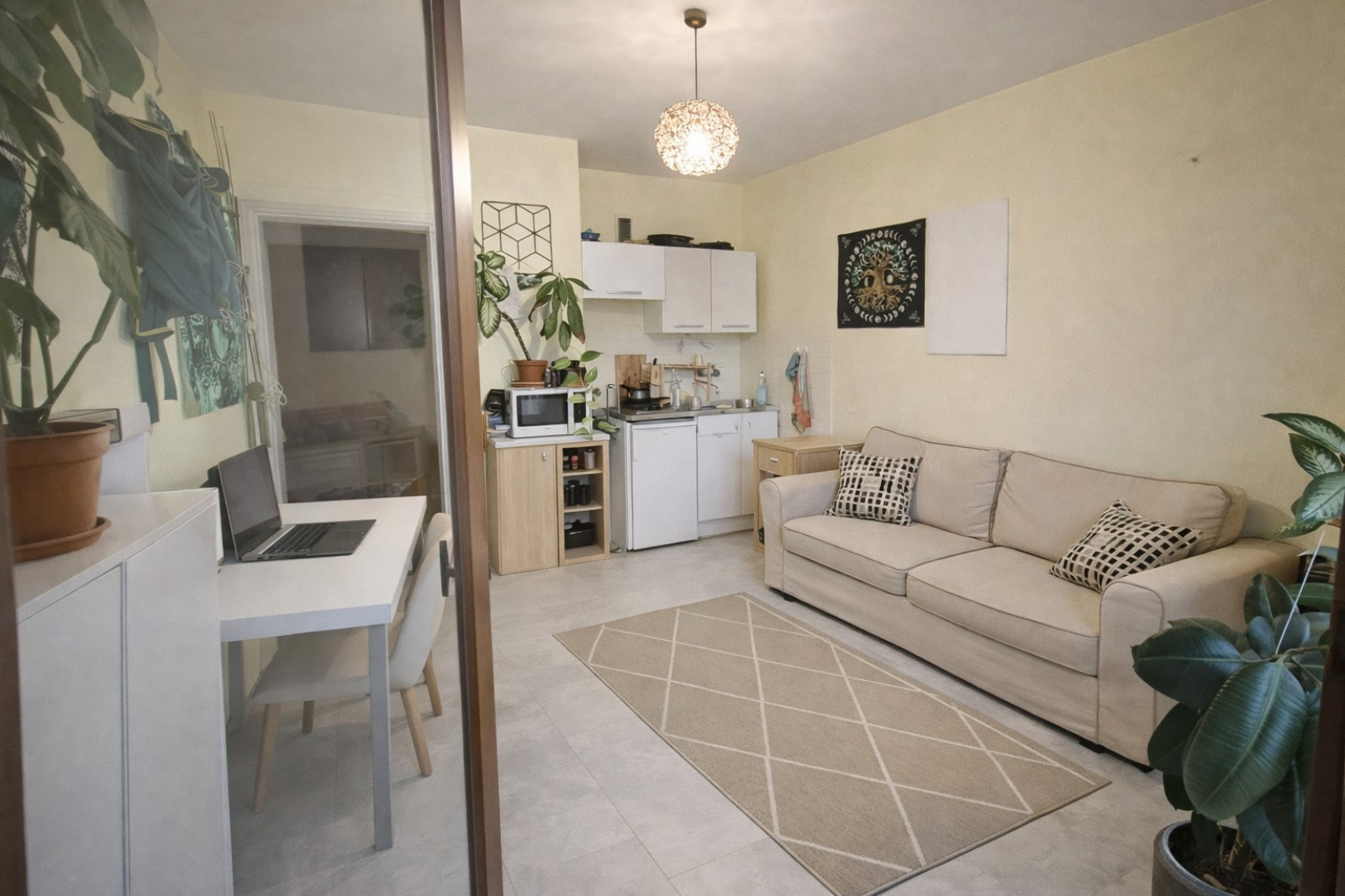 Il se compose d'une entrée avec rangement, un bel espace à vivre avec kitchenette équipée et terrasse de 5 m2 environ donnant sur les tennis de la résidence, et une salle d'eau.