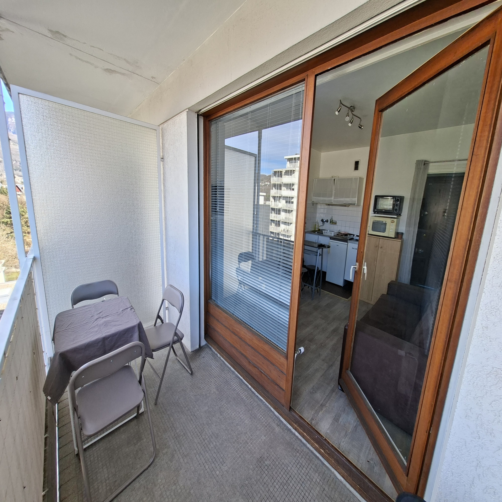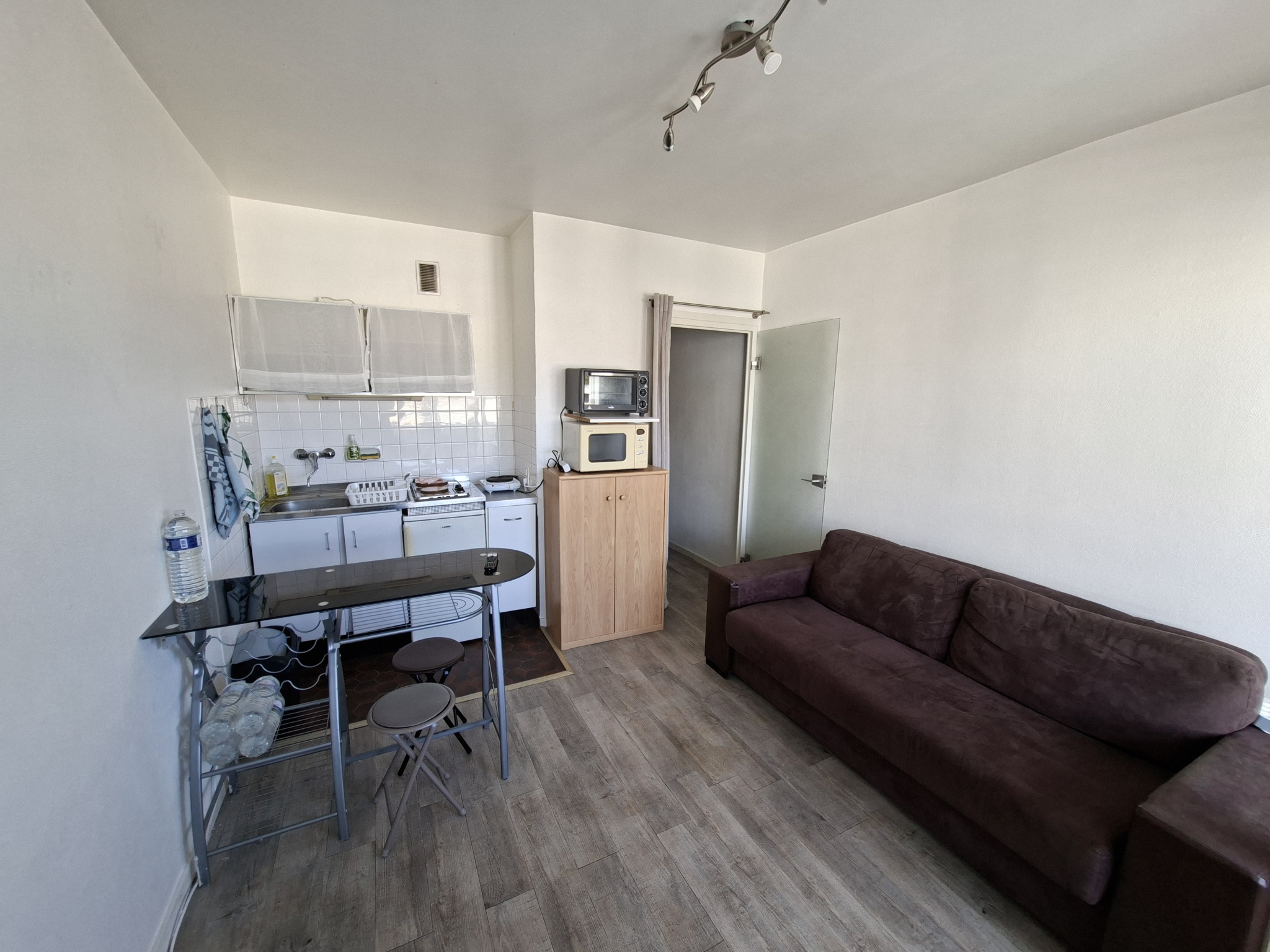 Il se compose d'une entrée avec rangement, un bel espace à vivre avec kitchenette équipée et terrasse de 6 m2 environ donnant sur la piscine de la résidence, et une salle d'eau.